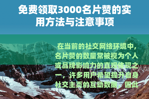 在当前的社交网络环境中,名片赞的数量常被视为个人或品牌影响力的直观体现之一,许多用户希望提升自身社交主页的互动数据,因此对于“免费领取3000名片赞”这一需求尤为关注,本文将介绍一些常见的可行途径,并提供相关建议,帮助您安全有效地达成目标。