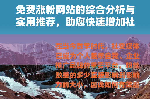 在当今数字时代,社交媒体已成为个人展示自我、企业推广品牌的重要平台,粉丝数量的多少直接影响到影响力的大小,因此如何有效涨粉成为许多用户关注的焦点,免费涨粉网站应运而生,为用户提供了一种经济便捷的途径来增加关注者,本文将详细介绍免费涨粉网站的基本原理、使用方法和相关建议,帮助您更好地利用这些工具提升社交媒体表现。