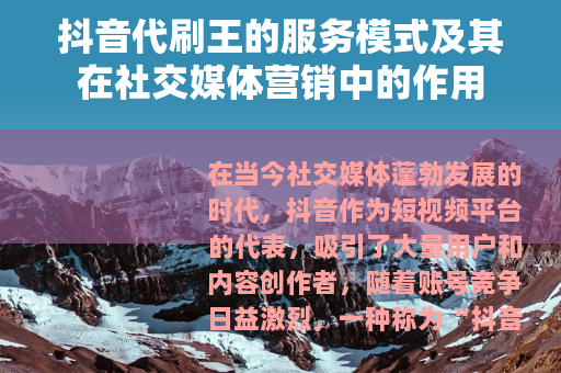在当今社交媒体蓬勃发展的时代,抖音作为短视频平台的代表,吸引了大量用户和内容创作者,随着账号竞争日益激烈,一种称为“抖音代刷王”的服务逐渐进入公众视野,这类服务主要专注于帮助用户提升账号的互动数据,如粉丝量、点赞数、评论和分享等,旨在增强账号的可见度和影响力,本文将从服务模式、用户需求、市场现状以及其在社交媒体营销中的角色等方面进行阐述。