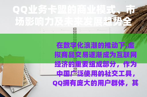 在数字化浪潮的推动下,虚拟商品交易逐渐成为互联网经济的重要组成部分,作为中国广泛使用的社交工具,QQ拥有庞大的用户群体,其衍生出的虚拟商品和服务市场需求持续增长,QQ业务卡盟应运而生,为用户提供便捷的QQ相关虚拟商品交易平台,本文将对QQ业务卡盟的定义、运营模式、市场角色以及未来发展进行系统阐述,以客观视角呈现这一领域的现状与前景。