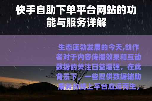 生态蓬勃发展的今天,创作者对于内容传播效果和互动数据的关注日益增强,在此背景下,一些提供数据辅助服务的线上平台应运而生,专注于快手渠道的自助下单平台网站,逐渐成为部分创作者运营工具箱中的选项之一,这类网站主要提供一种便捷的在线服务,用户可以通过其直观的界面,自主选择并订购诸如视频播放量、点赞、评论、粉丝关注等多项互动数据服务。