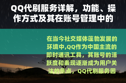 在当今社交媒体蓬勃发展的环境中,QQ作为中国主流的即时通讯工具,其账号的活跃度和表现逐渐成为用户关注的焦点,QQ代刷服务因此兴起,为用户提供了一种提升账号相关指标的辅助手段,这类服务主要通过技术或人工操作,帮助用户优化QQ账号的视觉和互动效果,从而增强社交影响力,本文将从服务内容、操作流程和应用场景等方面,对QQ代刷进行系统介绍。