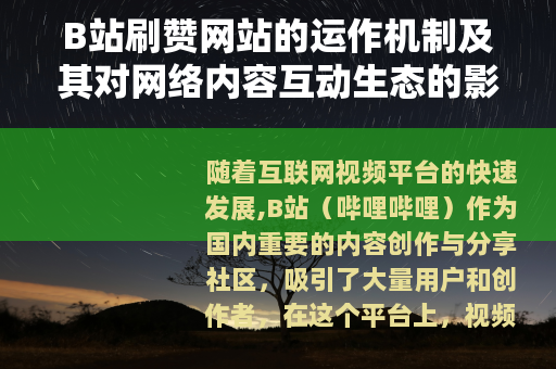 随着互联网视频平台的快速发展,B站(哔哩哔哩)作为国内重要的内容创作与分享社区,吸引了大量用户和创作者,在这个平台上,视频的点赞数不仅是观众对内容的直接反馈,也影响着内容的推荐范围和曝光度,一些提供刷赞服务的网站应运而生,这些网站通过技术或人工方式,为B站视频增加点赞数量,本文将从功能、背景、影响等方面,对B站刷赞网站进行客观讨论。