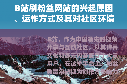 B站,作为中国领先的视频分享与互动社区,以其弹幕文化和多元内容吸引了大量用户,在这个平台上,粉丝数量常被视为创作者影响力与受欢迎程度的重要标志,随着社区规模的扩大,一些外部网站开始提供非正常的粉丝增长服务,通常被称为“刷粉丝网站”,这些网站通过技术或人工手段,帮助用户快速提升B站账号的粉丝数,本文将以客观视角描述这一现象,分析其背后的驱动因素,并讨论其对平台生态的潜在效应,同时避免主观评判,旨在提供全面的信息参考。