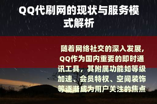 随着网络社交的深入发展,QQ作为国内重要的即时通讯工具,其附属功能如等级加速、会员特权、空间装饰等逐渐成为用户关注的焦点,在此背景下,QQ代刷网应运而生,为用户提供多样化的辅助服务,这类平台主要通过技术手段或人工操作,帮助用户实现特定功能的快速提升,满足部分用户对账号美化或功能增强的需求。