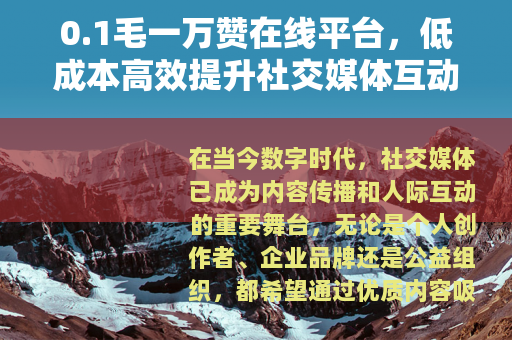 在当今数字时代,社交媒体已成为内容传播和人际互动的重要舞台,无论是个人创作者、企业品牌还是公益组织,都希望通过优质内容吸引关注,而点赞作为最直接的互动形式,往往能有效提升内容的可见度和影响力,对于许多资源有限的用户来说,快速获得大量点赞并非易事,为此,0.1毛一万赞在线平台应运而生,它以极低的成本提供高效的点赞服务,成为社交媒体推广中备受关注的选择,这类平台通过技术创新,连接供需双方,帮助用户在短时间内增强内容的热度,从而在信息洪流中脱颖而出,本文将全面介绍这一平台的特点、优势和使用方式,旨在为用户提供实用的参考信息。
