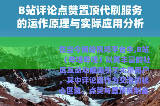 在当今网络视频平台中,B站(哔哩哔哩)以其丰富的社区互动功能吸引了大量用户,其中评论区作为交流的核心区域,点赞与置顶机制直接影响着内容的传播效果,B站评论点赞置顶代刷服务,即通过外部手段提升评论点赞数以实现置顶显示,已成为一种常见的互动优化方式,本文将从服务定义、运作机制、使用目的、效果及市场现状等方面,全面解析这一现象。