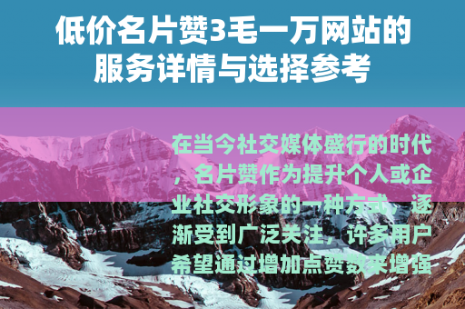 在当今社交媒体盛行的时代,名片赞作为提升个人或企业社交形象的一种方式,逐渐受到广泛关注,许多用户希望通过增加点赞数来增强社交影响力,从而促进互动或业务推广,市场上出现了多种提供点赞服务的平台,低价名片赞3毛一万网站”成为热门选择之一,这类网站以低廉的价格提供大量点赞,例如每三万赞仅需几毛钱,吸引了众多用户的兴趣。
