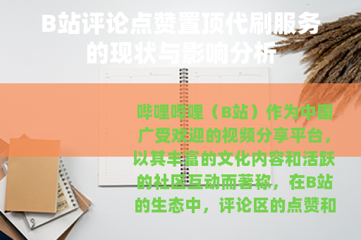 哔哩哔哩(B站)作为中国广受欢迎的视频分享平台,以其丰富的文化内容和活跃的社区互动而著称,在B站的生态中,评论区的点赞和置顶功能是用户交流与表达的核心环节,点赞数高的评论容易吸引更多注意力,而置顶评论则能优先展示,塑造视频的讨论风向,近年来,一种名为“评论点赞置顶代刷”的服务在网络上悄然兴起,它通过外部手段帮助用户提升评论的点赞数或实现置顶效果,成为社区互动中的一个值得关注的现象。