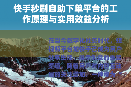 在当今数字化社交时代,短视频平台如快手已成为用户分享生活、展示创意的重要渠道,随着用户对内容互动量的关注增加,一种称为“快手秒刷自助下单平台”的服务逐渐受到留意,这类平台主要通过技术手段,为用户提供自助式下单功能,以提升视频的点赞、评论或分享等互动数据,本文将从其运作机制和潜在效益角度,进行简要介绍。