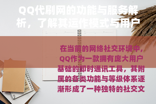 在当前的网络社交环境中,QQ作为一款拥有庞大用户基础的即时通讯工具,其附属的各类功能与等级体系逐渐形成了一种独特的社交文化,随着用户对账号个性化展示与功能体验需求的增长,衍生出了相应的服务市场,QQ代刷网便是这一市场环境中产生的一种服务类型,其主要为用户提供针对QQ平台相关功能的辅助服务。
