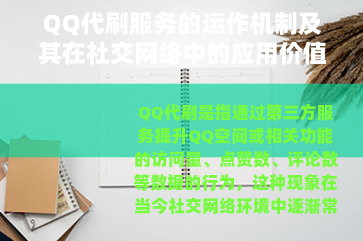 QQ代刷是指通过第三方服务提升QQ空间或相关功能的访问量、点赞数、评论数等数据的行为,这种现象在当今社交网络环境中逐渐常见,随着互联网社交平台的普及,用户对于个人或品牌影响力的重视程度日益增加,QQ作为中国广泛使用的即时通讯工具,其空间功能成为了展示个人生活、分享内容的重要窗口,QQ代刷服务应运而生,旨在帮助用户快速提升社交数据的表现,从而增强在线存在感,本文将客观介绍QQ代刷的基本原理、服务类型、用户需求以及实际应用场景,以提供一个全面的视角。