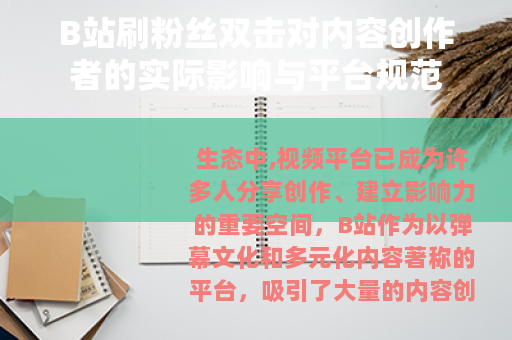 生态中,视频平台已成为许多人分享创作、建立影响力的重要空间,B站作为以弹幕文化和多元化内容著称的平台,吸引了大量的内容创作者,在这个过程中,一个名为“刷粉丝双击”的现象也出现在一些讨论之中,这通常指的是通过非平台常规推荐或自然互动增长的途径,短时间内获取粉丝关注与视频点赞数量的行为,本文将客观分析这一行为产生的背景、对创作者与平台环境可能带来的影响,以及平台现行的管理措施。 创作者在起步阶段都渴望获得更多的关注和互动,这是可以理解的,粉丝数量和视频点赞数常常被视作内容受欢迎程度的直观指标,也可能影响到商业合作的机遇,部分创作者可能会寻求某些方式来提升这些数据,这些方式的具体操作形式多样,但其核心目的是在短时间内让账号的数据指标呈现上升趋势。