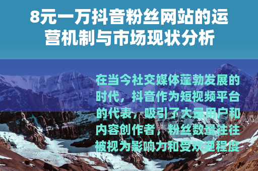 在当今社交媒体蓬勃发展的时代,抖音作为短视频平台的代表,吸引了大量用户和内容创作者,粉丝数量往往被视为影响力和受欢迎程度的指标之一,一些用户寻求快速增加粉丝的途径,提供“8元一万抖音粉丝”服务的网站逐渐进入公众视野,这类平台以低廉的价格提供粉丝增长服务,成为社交媒体营销中的一个现象。