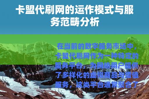 在当前的数字服务市场中,卡盟代刷网作为一种特定的服务平台,为网络用户提供了多样化的虚拟商品与增值服务,这类平台通常聚合了大量的供应商与渠道资源,通过系统化的方式满足用户在特定领域的线上需求,其运作模式和服务内容构成了一个值得关注的细分市场。