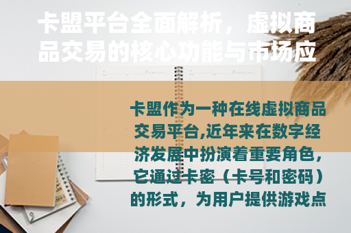 卡盟作为一种在线虚拟商品交易平台,近年来在数字经济发展中扮演着重要角色,它通过卡密(卡号和密码)的形式,为用户提供游戏点卡、软件授权、会员服务等数字产品的销售与兑换服务,随着互联网普及和虚拟消费需求增长,卡盟平台逐渐成为连接商家与消费者的桥梁,简化了交易流程,提升了市场效率,本文将系统介绍卡盟的定义、功能、应用场景及市场前景,帮助读者全面了解这一平台的运作机制和社会意义。