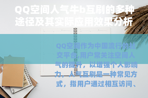 QQ空间作为中国流行的社交平台,用户常关注空间人气的提升,以增强个人影响力,人气互刷是一种常见方式,指用户通过相互访问、点赞或评论,共同提高彼此空间的人气值,这种方法简单易行,能快速带来明显效果,因此受到许多用户的欢迎。
