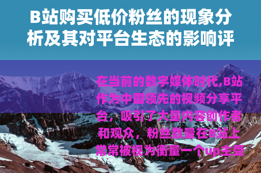 在当前的数字媒体时代,B站作为中国领先的视频分享平台,吸引了大量内容创作者和观众,粉丝数量在B站上常常被视为衡量一个up主受欢迎程度的重要指标,它不仅影响个人品牌的建立,还直接关系到平台的推荐算法和商业机会,随着竞争加剧,一些用户寻求快速增加粉丝数的方法,其中购买低价粉丝成为了一种可见的市场现象,这种行为背后涉及多种因素,同时也对平台生态产生着潜在的影响。