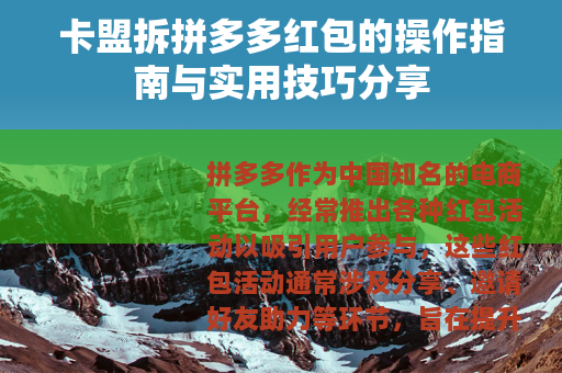 拼多多作为中国知名的电商平台,经常推出各种红包活动以吸引用户参与,这些红包活动通常涉及分享、邀请好友助力等环节,旨在提升用户互动和购物体验,对于一些用户来说,红包的拆分和使用过程可能较为复杂,需要借助外部资源来高效完成,卡盟平台作为一种网络资源交换和服务提供平台,为用户提供了拆解拼多多红包的便捷途径,帮助用户更顺利地参与活动。