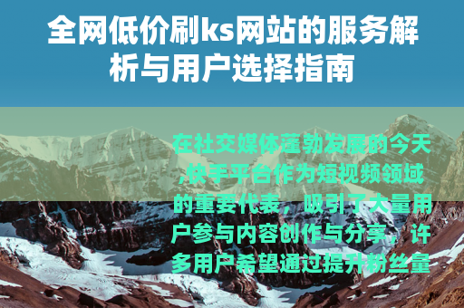 在社交媒体蓬勃发展的今天,快手平台作为短视频领域的重要代表,吸引了大量用户参与内容创作与分享,许多用户希望通过提升粉丝量和互动数据来增强影响力,全网低价刷ks网站因此应运而生,提供各类数据增长服务,这些网站以价格实惠为特点,为用户提供了一种快速改善账号表现的途径,在市场上逐渐受到关注。