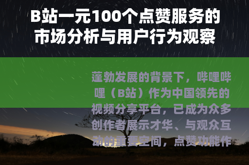 蓬勃发展的背景下,哔哩哔哩(B站)作为中国领先的视频分享平台,已成为众多创作者展示才华、与观众互动的重要空间,点赞功能作为B站互动体系的核心元素之一,不仅表达了用户对内容的认可,还在一定程度上影响视频的推荐算法和曝光率,近年来,市场上出现了一种名为“一元100个点赞”的服务,以极低的价格提供大量点赞,引发了广泛讨论,本文将从商业运作、用户动因和平台生态角度,对这一服务进行客观分析。