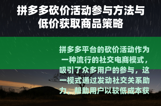 拼多多平台的砍价活动作为一种流行的社交电商模式,吸引了众多用户的参与,这一模式通过发动社交关系助力,帮助用户以较低成本获取所需商品,体现了共享与互助的互联网精神,对于想要参与其中的用户来说,了解其基本运作方式并采取恰当方法,能够提升获得心仪商品的效率。