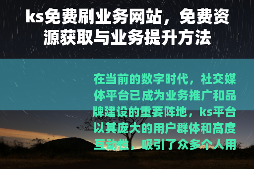 在当前的数字时代,社交媒体平台已成为业务推广和品牌建设的重要阵地,ks平台以其庞大的用户群体和高度互动性,吸引了众多个人用户和企业参与其中,为了在竞争中获得更多关注,一些用户开始寻找提升业务数据的方法,ks免费刷业务网站便应运而生,这类网站提供免费的工具和服务,帮助用户增强在ks平台上的表现,例如增加粉丝数、提高点赞量或优化互动率,本文将系统介绍这些网站的功能、访问途径、优势以及使用技巧,旨在为用户提供实用参考,助力业务发展。