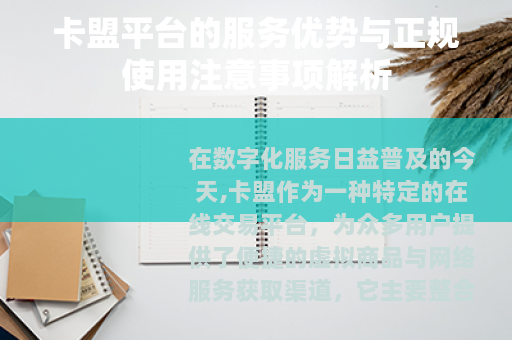 在数字化服务日益普及的今天,卡盟作为一种特定的在线交易平台,为众多用户提供了便捷的虚拟商品与网络服务获取渠道,它主要整合各类数字产品资源,通过集中的平台进行展示和销售,满足了用户在网络活动中的多样化需求。