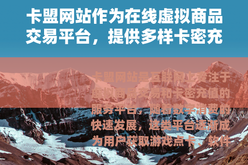 总体而言,卡盟网站通过提供高效、多样的虚拟商品交易服务,满足了现代数字生活的需求,它们不仅促进了虚拟经济的活跃,也为用户带来了实实在在的便利,展望未来,随着技术革新和市场扩展,卡盟网站将继续优化功能,丰富服务内容,在数字领域发挥更重要的作用。