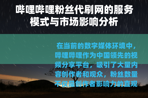 在当前的数字媒体环境中,哔哩哔哩作为中国领先的视频分享平台,吸引了大量内容创作者和观众,粉丝数量不仅是创作者影响力的直观体现,还关系到其商业合作机会和社区认可度,一些创作者寻求快速提升粉丝数的方法,这催生了哔哩哔哩粉丝代刷网的服务,这类网站通过技术手段或人工操作,为用户的哔哩哔哩账号提供粉丝增长支持,本文将从服务模式、用户需求、市场现状和整体影响等方面,对哔哩哔哩粉丝代刷网进行客观分析。