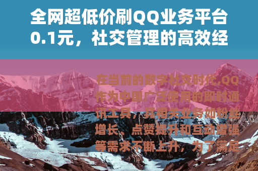 在当前的数字社交时代,QQ作为中国广泛使用的即时通讯工具,其相关业务如粉丝增长、点赞提升和互动增强等需求不断上升,为了满足用户对成本效益的追求,全网超低价刷QQ业务平台0.1元应运而生,成为许多用户优化社交表现的首选,该平台以极低的价格为核心,提供多样化的服务选项,帮助个人和企业以最小投入实现QQ社交影响力的快速提升。