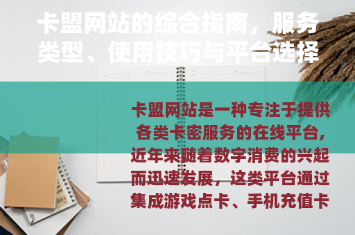 总体而言,卡盟网站作为一种现代化的卡密交易平台,以其便捷性、多样性和高效性赢得了用户的青睐,通过合理选择平台并遵循使用建议,用户可以充分享受其带来的便利,随着技术的不断升级和市场的发展,卡盟网站将继续完善服务,为人们的数字生活提供更多支持。