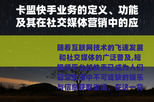 随着互联网技术的飞速发展和社交媒体的广泛普及,短视频平台如快手已成为人们日常生活中不可或缺的娱乐与信息获取渠道,在这一背景下,卡盟快手业务逐渐崭露头角,为许多用户提供了便捷的服务支持,本文将从卡盟快手业务的基本概念入手,详细阐述其功能特点、实际应用场景以及对社会和商业活动的积极影响,旨在帮助读者全面理解这一业务的运作方式与潜在益处。