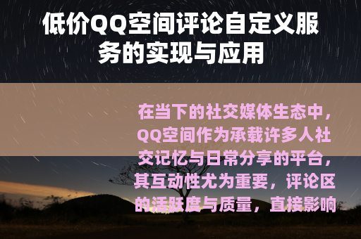 低价QQ空间自定义评论服务,是网络社交文化衍生出的一种特定市场现象,它依托于基础的网络自动化技术,响应了部分用户对快速获得形式化互动的需求,在合理的范围内,将其用于营造轻松的娱乐氛围或非关键的场景补充,未尝不可,健康的网络社交环境,终究建立在真实、自愿的互动之上,无论是服务提供者还是使用者,均需以平和的心态看待其工具属性,将其置于恰当的辅助位置,而非主导社交体验的核心。