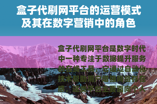 盒子代刷网平台是数字时代中一种专注于数据提升服务的在线工具,它通过自动化技术帮助用户增强网络存在感,这类平台主要面向个人创作者、中小企业及营销机构,提供快速增加网站流量、社交媒体互动或其他在线指标的服务,随着互联网经济的快速发展,数据成为衡量在线成功的关键因素之一,盒子代刷网平台因此应运而生,成为数字营销生态中的一部分,本文将从平台概述、服务内容、技术实现、应用场景、优势分析、行业影响和未来发展等方面,全面介绍这一平台的特点与功能。
