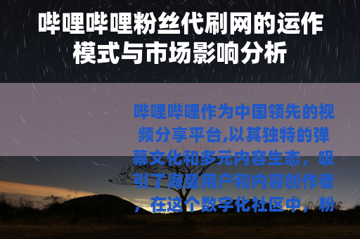 哔哩哔哩作为中国领先的视频分享平台,以其独特的弹幕文化和多元内容生态,吸引了海量用户和内容创作者,在这个数字化社区中,粉丝数量不仅是创作者影响力的象征,还直接关联到商业合作机会和个人品牌价值,随着平台竞争日益激烈,一种名为“粉丝代刷网”的服务逐渐兴起,这些网站专注于为哔哩哔哩用户提供粉丝数、视频播放量、点赞评论等数据的提升服务,本文将从客观角度出发,探讨粉丝代刷网的服务特性、用户需求、运作机制及其对网络环境的影响,以提供全面的视角。