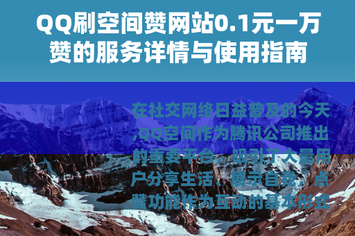 在社交网络日益普及的今天,QQ空间作为腾讯公司推出的重要平台,吸引了大量用户分享生活、展示自我,点赞功能作为互动的基本形式之一,不仅增强了用户之间的连接,还成为衡量内容受欢迎程度的参考指标,随着用户对空间人气提升的需求增长,一些网站推出了刷赞服务,其中以0.1元一万赞的价格尤为引人注目,这类服务通过技术手段,帮助用户快速增加点赞数量,从而提升空间的活跃度和可见性,本文将全面介绍这种服务的运作方式、特点及使用建议,旨在为用户提供参考信息。