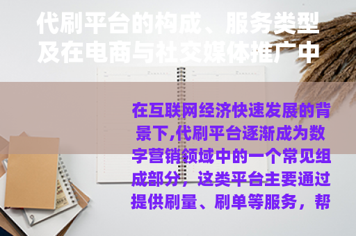 在互联网经济快速发展的背景下,代刷平台逐渐成为数字营销领域中的一个常见组成部分,这类平台主要通过提供刷量、刷单等服务,帮助用户提升网络数据指标,从而增强在线可见性或影响力,代刷平台的兴起与电子商务、社交媒体的普及紧密相关,它们为用户提供了一种便捷方式来优化其网络表现,应对数据驱动的竞争环境,本文将从代刷平台的基本构成、服务类型出发,探讨其在电商和社交媒体推广中的应用,并分析相关行业现状与发展趋势。