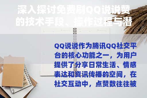 QQ说说作为腾讯QQ社交平台的核心功能之一,为用户提供了分享日常生活、情感表达和资讯传播的空间,在社交互动中,点赞数往往被视为内容受欢迎程度的指标,不少用户寻求免费刷QQ说说赞的方式来提升互动数据,这种现象随着网络技术的发展而逐渐普及,相关工具和方法也层出不穷,本文将从技术手段、操作过程和潜在效果三个方面,系统介绍免费刷QQ说说赞的相关内容,旨在提供一份全面的参考指南。