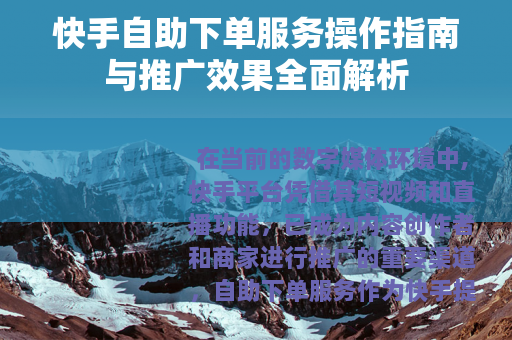 在当前的数字媒体环境中,快手平台凭借其短视频和直播功能,已成为内容创作者和商家进行推广的重要渠道,自助下单服务作为快手提供的一项便捷工具,允许用户自主选择并购买推广资源,从而提升内容的曝光度和互动性,本文将系统介绍这一服务的操作方式、优势以及适用场景,帮助用户更好地利用该功能。