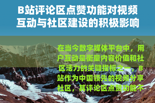 在当今数字媒体平台中,用户互动是衡量内容价值和社区活力的关键指标之一,B站作为中国领先的视频分享社区,其评论区点赞功能不仅丰富了用户体验,还为视频互动和社区建设提供了有力支持,本文将深入探讨B站评论区点赞功能的机制、对用户行为的引导作用,以及它在促进社区积极氛围方面的贡献。