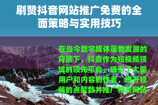 在当今数字媒体蓬勃发展的背景下,抖音作为短视频领域的领先平台,吸引了大量用户和内容创作者,提升视频的点赞数并推广相关网站,成为许多人增强网络影响力的常见目标,刷赞抖音网站推广免费的方法,为那些希望以低成本实现推广效果的个人或小型团队提供了可行路径,通过合理利用免费资源和策略,不仅可以增加视频曝光度,还能引导流量至外部网站,从而构建更广泛的品牌认知。