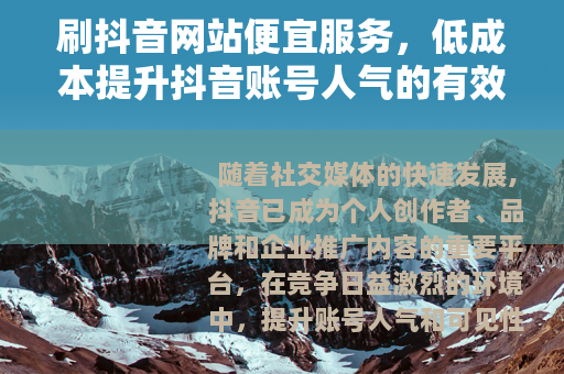 随着社交媒体的快速发展,抖音已成为个人创作者、品牌和企业推广内容的重要平台,在竞争日益激烈的环境中,提升账号人气和可见性成为许多用户关注的焦点,刷抖音网站便宜服务应运而生,为用户提供了一种经济实惠的推广方式,帮助他们在有限预算下实现账号指标的快速提升。