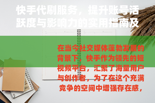 在当今社交媒体蓬勃发展的背景下,快手作为领先的短视频平台,汇聚了海量用户与创作者,为了在这个充满竞争的空间中增强存在感,许多用户开始关注代刷服务,以期优化账号的数据表现,快手代刷通常指通过外部服务增加粉丝数、点赞、评论或分享等互动指标的做法,这一服务在数字营销领域日益普及,主要目标是帮助账号在较短时间内提升关注度,从而支持个人或商业目标的实现。
