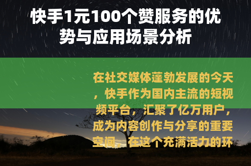 在社交媒体蓬勃发展的今天,快手作为国内主流的短视频平台,汇聚了亿万用户,成为内容创作与分享的重要空间,在这个充满活力的环境中,点赞数作为衡量视频受欢迎程度的核心指标之一,不仅反映了观众的认可,还直接影响到内容在平台推荐系统中的曝光机会,高点赞数能够助力视频进入热门流量池,从而吸引更多自然观看与互动,近年来,一种名为“1元100个赞”的服务进入公众视野,它以较低成本帮助用户提升互动数据,成为许多创作者考虑的选择。