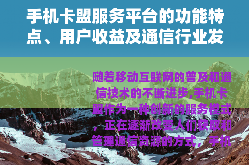 随着移动互联网的普及和通信技术的不断进步,手机卡盟作为一种创新的服务模式,正在逐渐改变人们获取和管理通信资源的方式,手机卡盟通常指通过联盟或平台化运营,整合多类手机卡及相关服务的体系,旨在为用户提供便捷、高效的通信解决方案,本文将从手机卡盟的基本概念入手,详细解析其服务内容、突出优势,并探讨其在当前通信行业中的发展前景,以期为用户和行业从业者提供参考。
