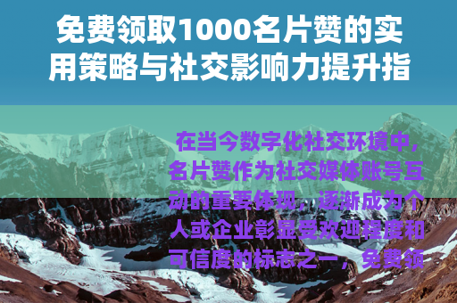 总体而言,免费领取1000名片赞是一个简单且有效的社交提升手段,通过合理利用免费资源,用户可以快速增强账号影响力,为个人或商业目标助力,社交媒体的核心仍在于真实连接和价值创造,点赞只是互动的一种形式,最终成功还需依赖于优质内容和真诚交流,希望本文提供的方案能帮助读者在社交道路上更进一步,实现可持续的成长与发展,随着社交媒体生态的演变,免费点赞的方式可能会更新,但基本原则不变:以正当途径获取资源,用心经营社交关系,方能收获长远回报。