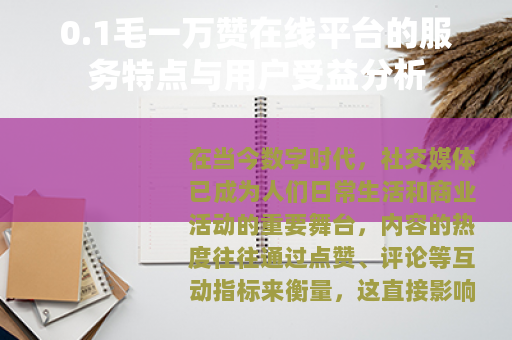 在当今数字时代,社交媒体已成为人们日常生活和商业活动的重要舞台,内容的热度往往通过点赞、评论等互动指标来衡量,这直接影响了个人创作者的自信心与企业品牌的知名度,随着市场需求的增长,一种名为“0.1毛一万赞在线平台”的服务应运而生,以其极低的价格和高效的服务,帮助用户快速提升内容影响力,本文将系统介绍该平台的服务机制、市场背景及其对用户的积极意义,为读者提供全面了解。