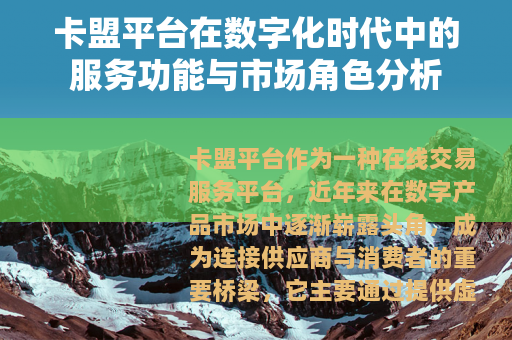 卡盟平台作为一种在线交易服务平台,近年来在数字产品市场中逐渐崭露头角,成为连接供应商与消费者的重要桥梁,它主要通过提供虚拟商品和服务的交易支持,满足用户在游戏、通讯、软件等领域的多样化需求,随着互联网经济的快速发展,卡盟平台不仅简化了传统交易流程,还为中小企业和个人用户带来了更多便利,本文将围绕卡盟平台的核心功能、运作模式、市场应用及未来前景展开讨论,以客观视角呈现其在当代电商环境中的价值。