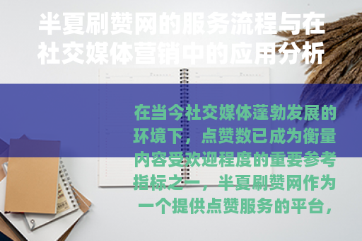在当今社交媒体蓬勃发展的环境下,点赞数已成为衡量内容受欢迎程度的重要参考指标之一,半夏刷赞网作为一个提供点赞服务的平台,通过系统化操作帮助用户提升内容的互动数据,吸引了众多个人用户和商业账号的关注,该网站的服务流程设计简洁,用户只需注册账号、提交内容链接、选择服务套餐并完成支付,即可在指定时间内获得点赞支持,这种模式旨在满足用户在网络推广中的短期需求,尤其适用于新兴品牌或个人创作者希望快速增强内容曝光的情况。